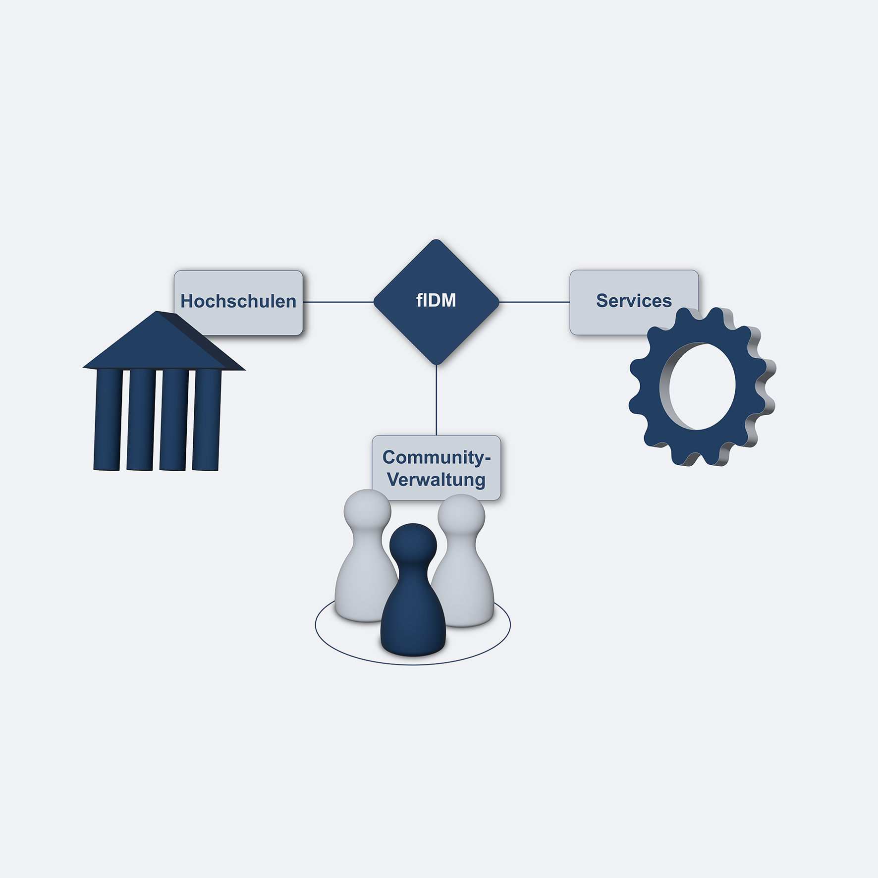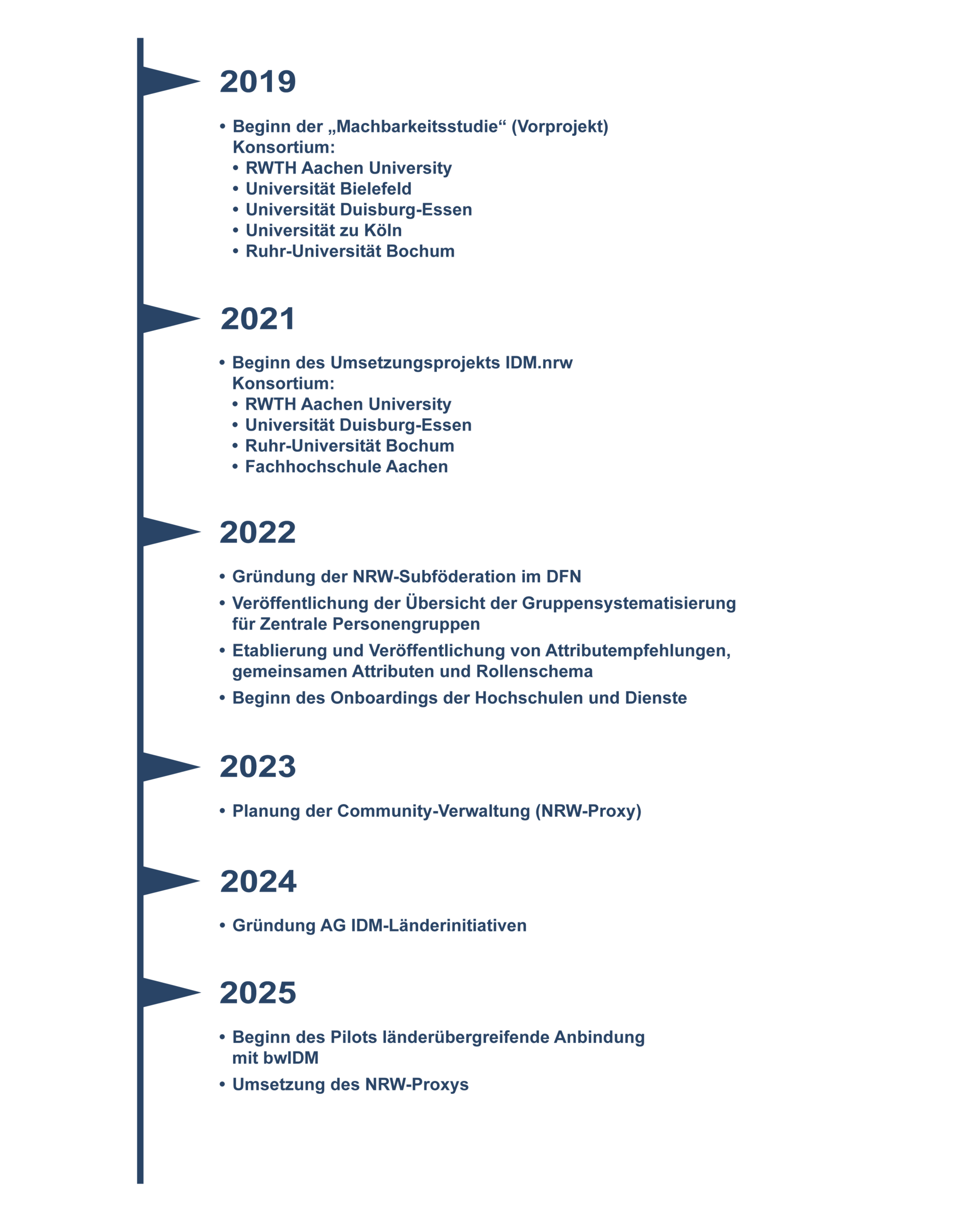 Die Geschäftsstelle IDM.nrw ist aus dem gleichnamigen Projekt der Digitalen Hochschule NRW (DH.NRW) entstanden, das sich zum Ziel gesetzt hatte, ein föderiertes Identity Management (FIDM) in Nordrhein-Westfalen und über die Bundesländergrenzen hinaus aufzubauen. Dabei wird eine nahtlose Verbindung zwischen den Identity Management-Systemen der Hochschulen geschaffen, sodass Studierende, Lehrende und Mitarbeitende eine einzige digitale Identität nutzen können. Dies ermöglicht, dass Mitglieder einer Hochschule mit ihrer hochschuleigenen Identität auch auf Dienste außerhalb ihrer Hochschule zugreifen können.